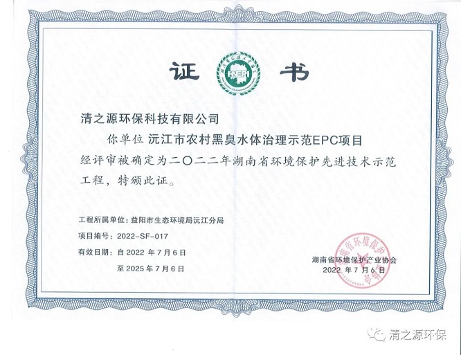 同年,公司承擔的沅江市農村黑臭水體污视频免费示範EPC項目,經評審成為湖南省第一批農村黑臭水體試點示範項目。